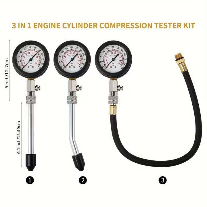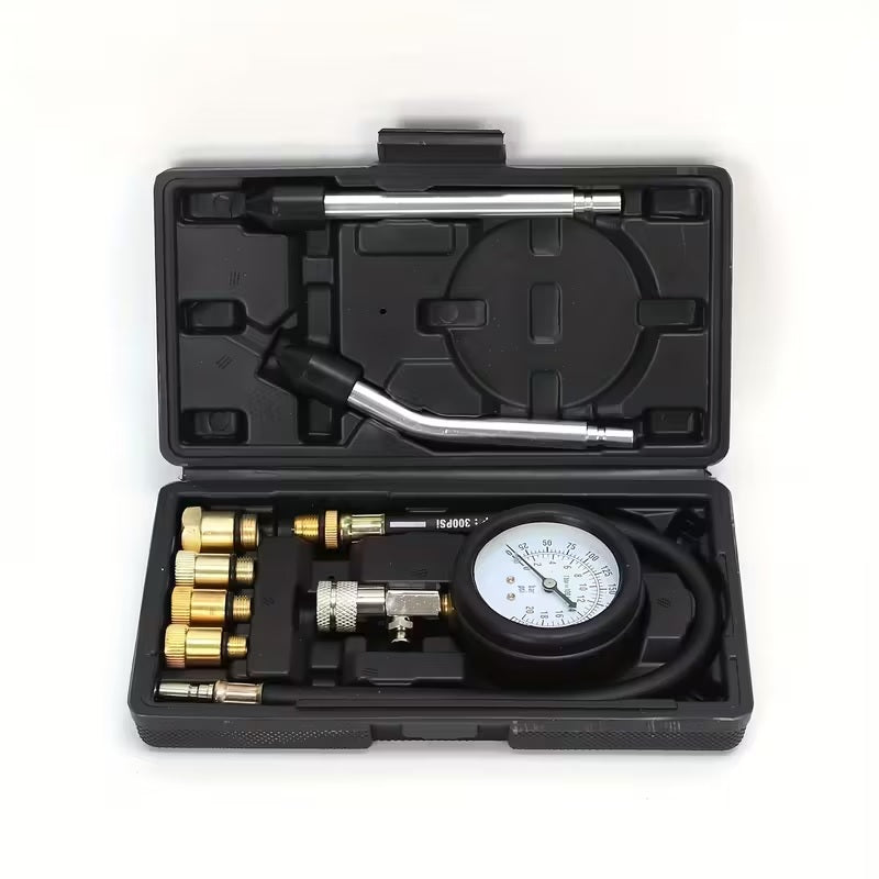 A diagnostic tool for gasoline engines that measures cylinder pressure to identify internal engine problems like worn piston rings, bad valves, or a blown head gasket.